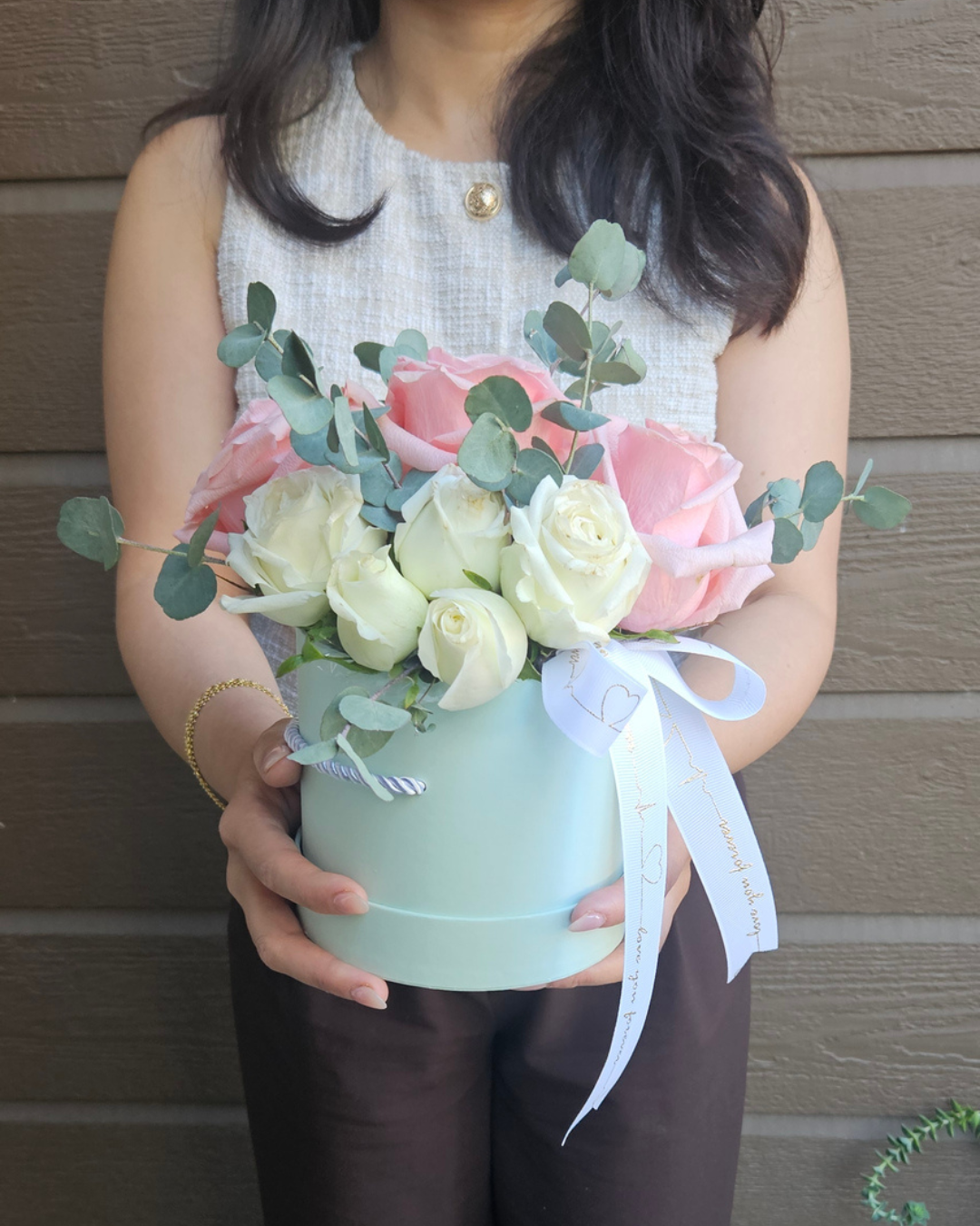 Delicate and charming, this all-around floral arrangement features premium blush Ecuadorian roses paired with soft white spray roses for a timeless, romantic look. Expertly arranged in a stylish round hat box (approximately 6 inches in diameter), this arrangement is perfect for gifting or adding a touch of elegance to any space. Shown here in our petite size.